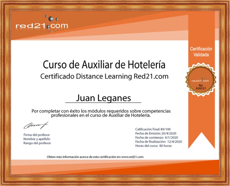 Al presentar, y aprobar la prueba final, recibirás un certificado de Aprobación del curso emitido por la Distance Learning Red21.com Corporate System reconocido por las principales empresas bajo la modalidad de enseñanza privada. A continuación un ejemplo de un certificado.